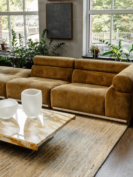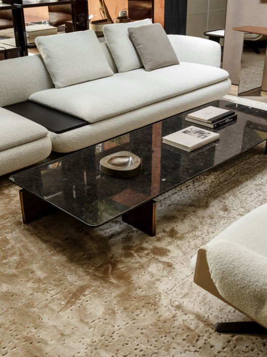 Строгость форм и изысканность материалов, легкость конструкций – облик этой мебели буквально прошит нитями высокой моды haute couture. Отсылки к мастерству изготовления кожаных изделий, к примеру, сумок или багажа,  видны в подголовниках, окантовке структурных оснований, даже в изящной отделке поверхности столика Flap. Между тем структурная основа дивана Connery специально приподнята над землей, что придает мебели еще более привлекательный, воздушный и легкий вид.